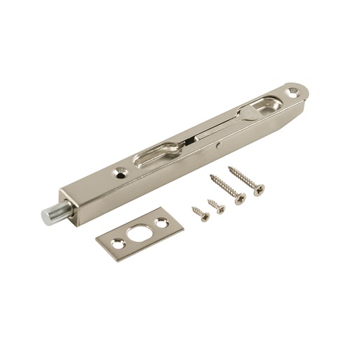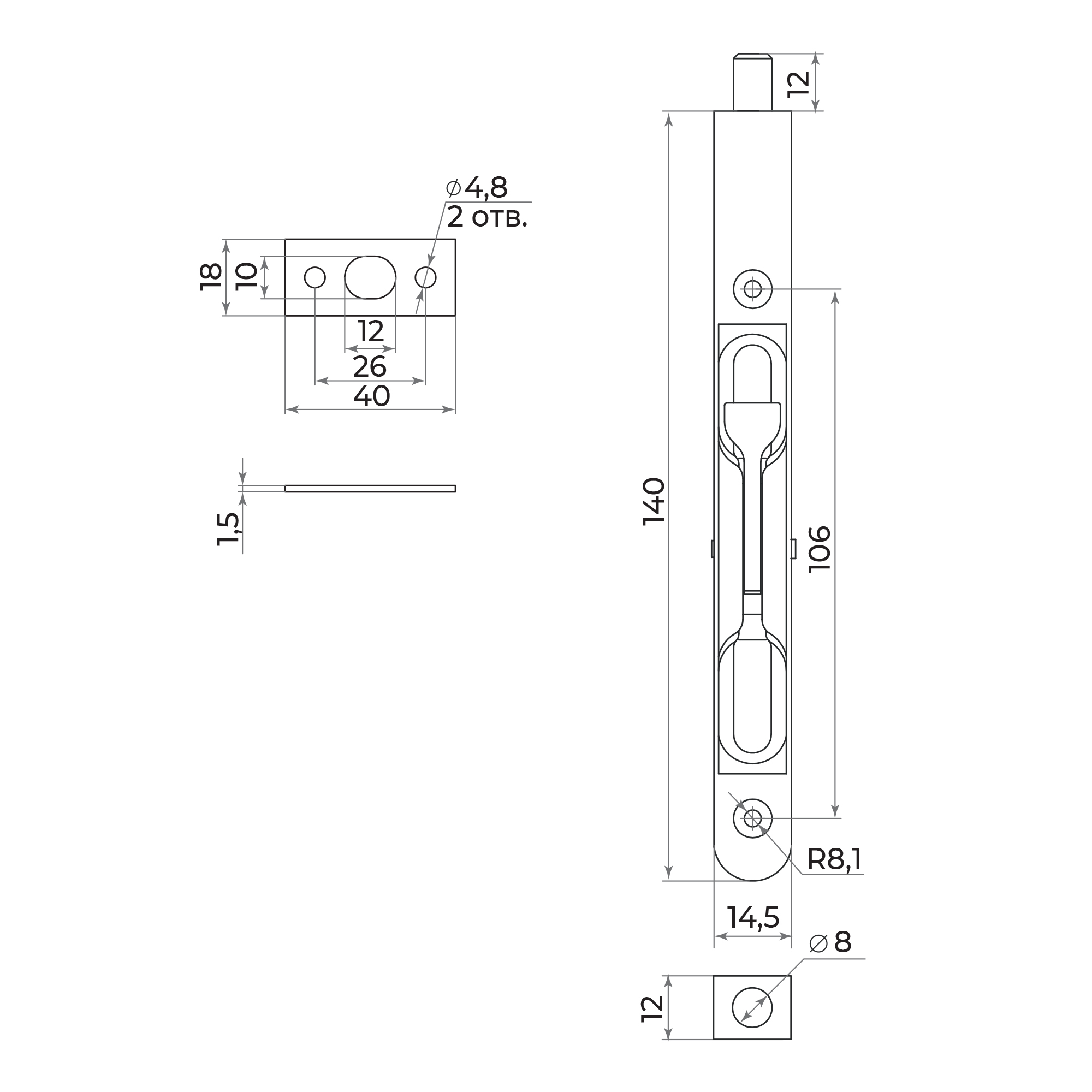 Диаметр ригеля: 8 мм. Длина упора: 140 мм, расстояние между монтажными отверстиями: 106 мм. Ответная планка и крепёж в комплекте. Со скругленным концом под врезку.