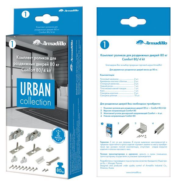 Комплект роликов для раздвижных дверей DIY Comfort 80/4 kit (877+882) рассчитан для установки в полотна весом 10 - 80 кг, шириной от 26 мм.