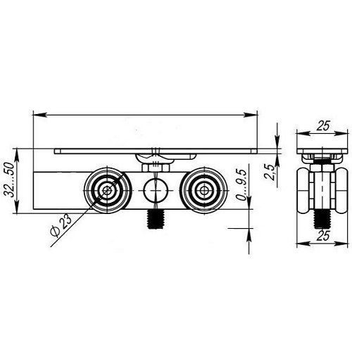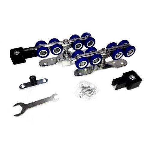 Комплект роликов для раздвижных дверей R3017 (4 оси) с фиксатором. Модель ролика отличается не только прочной кареткой и подшипниковыми колесами, но и количеством колес - их 8 штук на одной каретке, что дает возможность подвешивать тяжелые раздвижные двери. Ролик может устанавливаться на раздвижные полотна шириной до 2-х метров, тогда в зависимости от веса полотна используется 4 каретки (для усиления). Комплект роликов для тяжелых раздвижных дверей состоит из: 2 каретки, 2 монтажные пластины, 2 стопора, 1 нижний направляющий ролик.