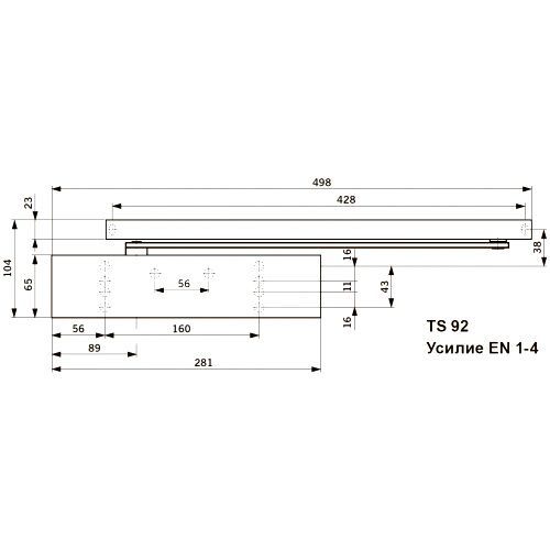 Dorma TS-92 B EN 1-4 серый дверной доводчик без рычага для дверей весом до 100 кг; Максимальная ширина двери: 1100 мм; Усилие закрывания: EN 1-4; Размеры 281х65х47 мм; Вес 2000 грамм; Цвет серый; Универсальность: для одностворчатых и двустворчатых дверей, подходит для левой и правой двери; (B обозначает: тело доводчика устанавливается на дверное полотно со стороны петель или на раму со стороны, противоположной петлям); Рабочая температура -15...+40 °С.