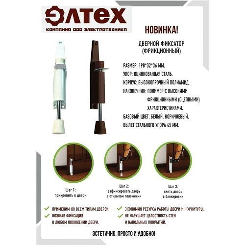 Дверной фиксатор ЭЛТЕХ применим ко всем типам дверей. Ножная фиксация в любом положении двери делает фиксатор простым и удобрым в применении.