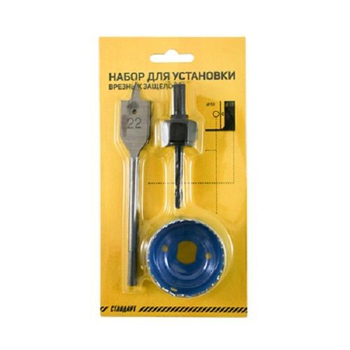 Набор для установки защелок-кноб. В комплекте - сверло перовое с хвостовиком d=22 мм, кольцевая пила d=54 мм, направляющее сверло для кольцевой пилы d=6 мм. Отличается качественной заточкой и долговечностью службы.