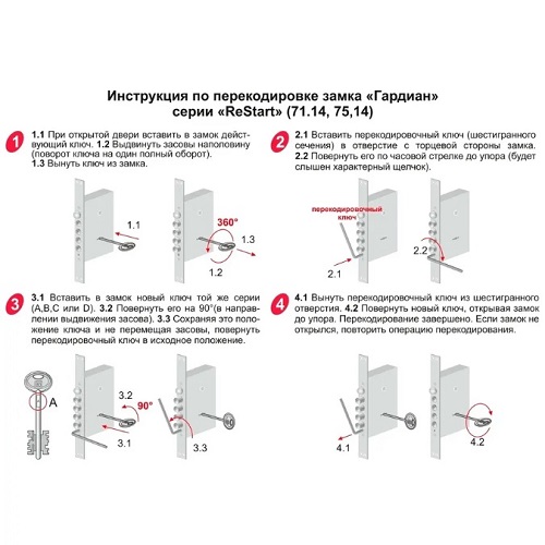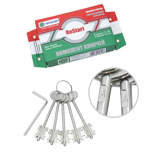 Запечатанный комплект ключей для перекодировки замков Гардиан серии ReStart. Подходит для моделей замков 71.14 и 75.14. Помимо этого используется на замке Blockido Duo 1 Чтобы перекодировка прошла успешно, важно купить точно такую же серию ключей, как у вас сейчас. Серия ключей вашего замка определяется легко - её можно найти на стержне рабочего ключа, который сейчас открывает и закрывает замок. Пожалуйста, отнеситесь внимательно к выбору серии - вскрытые ключи возврату и обмен не подлежат.