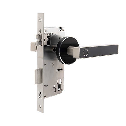 Механическая часть представляет собой корпус замка с МО 85 мм и бэксет 60 мм. Электронная часть представлена нажимной ручкой со встроенным датчиком отпечатков пальца. Материал ручки - ЦАМ/пластик.