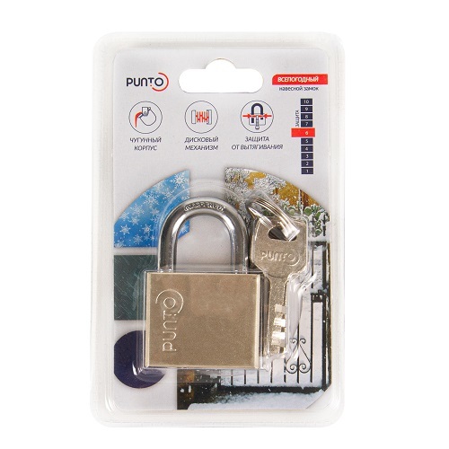 Всепогодный навесной замок Punto PL-15 изготовлен из литого чугуна с антикоррозийным покрытием. Закаленная дужка для защиты от перепиливания.