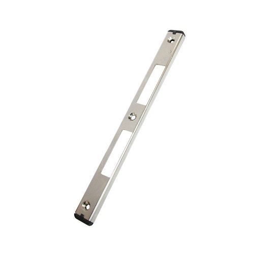 Ответная планка 11.535 левая для замков серии PROFI с ригелем и защелкой. Подходит для установки в пластиковые и алюминиевые двери. Планка нерегулируемая из металлического профиля, с торцов пластиковые заглушки, покрытие никель.