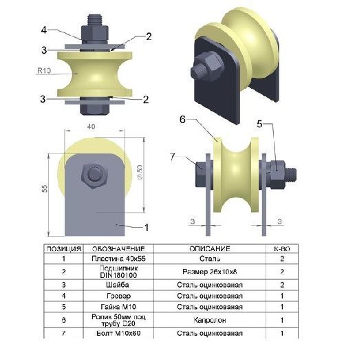 Ролик используется для устройства раздвижных уличных оград. В качестве направляющей используется труба, которая устраивается на бетонное основание. Ролик оснащен двумя подшипниками.