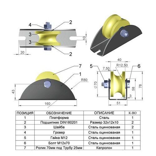 Ролик используется для устройства раздвижных (откатных) ворот. Платформа ролика привариваюся к нижней раме ворот. В качестве направляющей используется труба 3/4", которая устраивается на бетонное основание. Ролик оснащен двумя подшипниками.