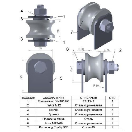 Ролик используется для устройства раздвижных уличных оград. В качестве направляющей используется профильная труба 1/2", которая устраивается на бетонное основание. Ролик оснащен двумя подшипниками.