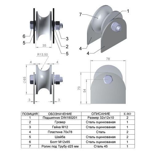 Ролик используется для устройства раздвижных (откатных) ворот. Пластины ролика привариваюся к нижней раме ворот. В качестве направляющей используется труба 3/4", которая устраивается на бетонное основание. Ролик оснащен двумя шариковыми подшипниками.