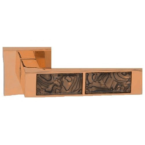 Дизайн дверной ручки выполнен в стиле модерн. Квадратная розетка в цвете меди и основная часть изделия прекрасно сочетаются с коричневой вставкой на лицевой части. Подобная фурнитура подчеркнет изящество и благородство классических и современных дверных полотен.