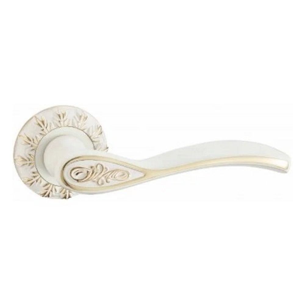 Комплект дверных ручек белого цвета, с узором золотого оттенка. Материал - ЦАМ.