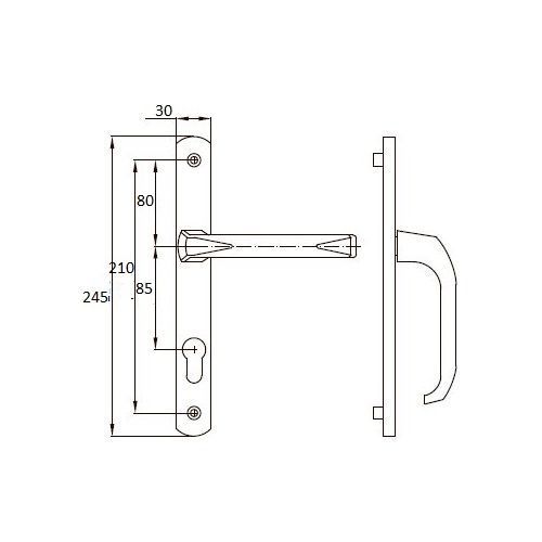 Длинная планка для использования с цилиндрами DIN стандарта. Ширина длинной планки 30 мм. Межосевое расстояние 85 мм. Ручки могут использоваться с замками полуавтоматами/автоматами - запирание поворотом ручки вверх.