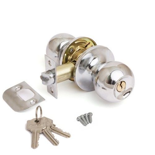 Ручка-защелка для межкомнатных дверей. Форма ручки - кнопка, круглая. Материал - сталь, гальваническое покрытие. Предназначена для дверей толщиной 35-45 мм. Регулируемое расстояние от края двери до оси ручек 60-70 мм. В комплекте 3 ключа.