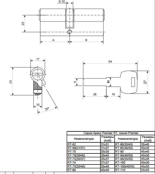Цилиндры серии RT с профильным ключом - максимальная работоспособность и хороший уровень защиты, особенно в сочетании с броненакладками. Сертифицированы на 3-й класс по ГОСТ Р 5089-2011. Два опорных пина с проточкой для защиты от вскрытия отмычками. Закаленный штифт в сердечнике и штифт в торце корпуса цилиндра для защиты от высверливания. Два опорных пина из закаленной стали для противодействия вытягиванию сердечника и дополнительной защиты от высверливания. Теоретическая секретность: 46 656 Линия продукции: Premier.