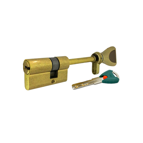 Цилиндровый механизм с отрезным штоком. Шток отрезается в размер после установки цилиндра в дверь, с учетом глубины отверстия в поворотной ручке. Размер до центра отверстия крепления винта - 40 мм. Цвет - золото.
