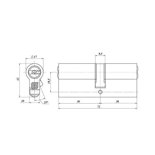 Цилиндровый механизм Гардиан серии GB - Guardian Basic выполнен из латуни, сертифицирован согласно 2ому классу безопасности. 6 латунных комбинативных пинов обеспечивают более 46 000 комбинаций. Работоспособность более 120 000 циклов. Имеет защиту от бампинга (2 плунжера ступенчатой формы), защиту от отмычек (2 плунжера ступенчатой формы), защиту от высверливания (2 закаленных штифта). Тип ключа: перфорированный. Исполнение: ключ-ключ. Размер: 72 мм (36/36). Комплектуется 5-ю ключами. Цвет: никель.