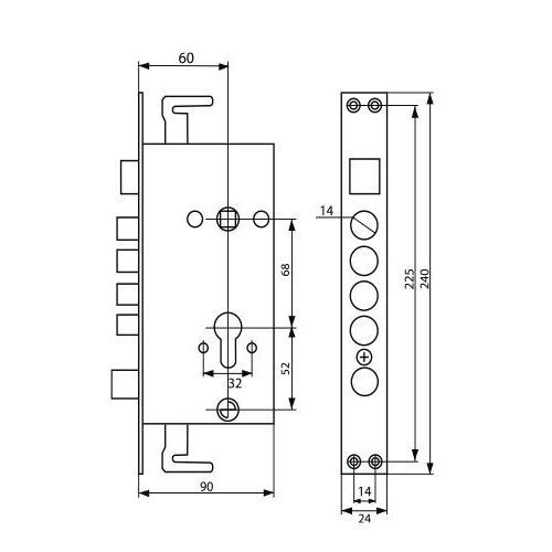 Замок 2524-4р с защелкой и задвижкой . Предназначен для установки в китайские металлические двери. Замок оборудован двумя вертикальными приводами на тяги. Может использоваться на дверях правого и левого открывания, направление открывания меняется на замке путем выдавливания и проворачивания защелки. Межосевое расстояние 68 мм.