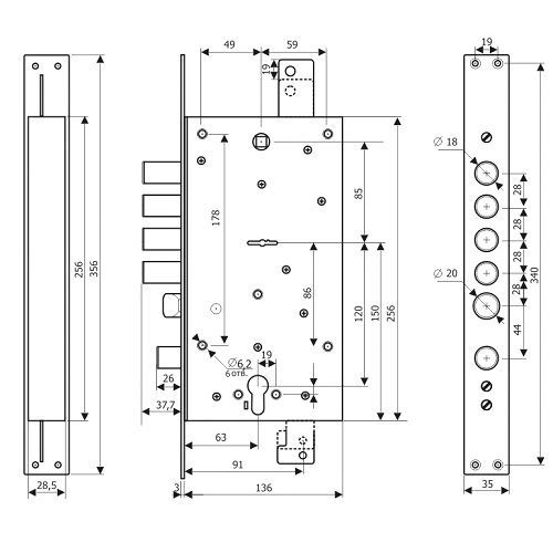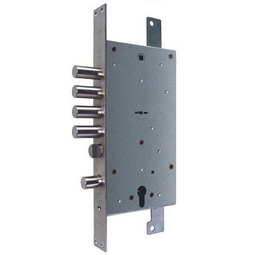 ЗВ 2512 Т - Замок врезной двухсистемный с выводами под тяги. Два механизма секретности, верхний сувальдный, нижний цилиндровый. Реверсивная защелка, переворот защелки осуществляется без разбора замка. Возможность установки броненакладки на цилиндровый механизм. Защита от наиболее распространенных методов вскрытия: защита от вскрытия отмычкой - ложные пазы на стойке и сувальдах, увеличенная жесткость пружин сувальд; защита от взлома – усиленная конструкция засова; защита от высверливания – закаленная стойка рейки хвостовика; защита от «свертыша» – ослабленный зуб рейки хвостовика. Замок предназначен для установки в металлические двери, шкафы и сейфы.