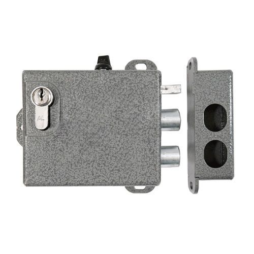 Накладной, универсальный. Снаружи и изнутри открывается ключом. Два засова. Переворот взводного кулачка. Задержка выхода засовов при взводе кулачка. Блокировка от закрывания