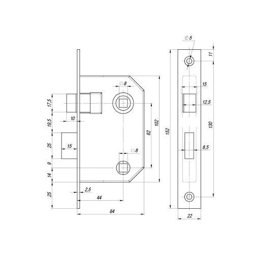 Врезной замок 251 сантехнический. Количество ригелей 1 Бексет, мм 44мм Межосевое расстояние 62мм Диаметр ригелей, 12мм