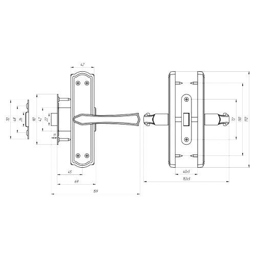 Защелка универсальная для деревянных межкомнатных дверей в комлекте с ручками на планке Avers ЗЩ1-2-6 (бронза)