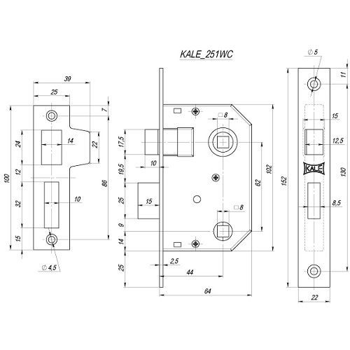 Защёлка для санузловых дверей с сечением квадрата под ручку - 8 мм. и под фиксатор - 8 мм. Межосевое расстояние 62мм.