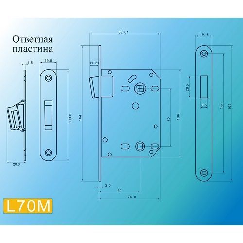 Замок магнитный врезной межкомнатный. Удаление от края двери до середины квадрата 50 мм , межосевое расстояние 70 мм , высота 106 мм, ширина 74 мм. Магнитный язык сверху. Цвет - матовый никель.