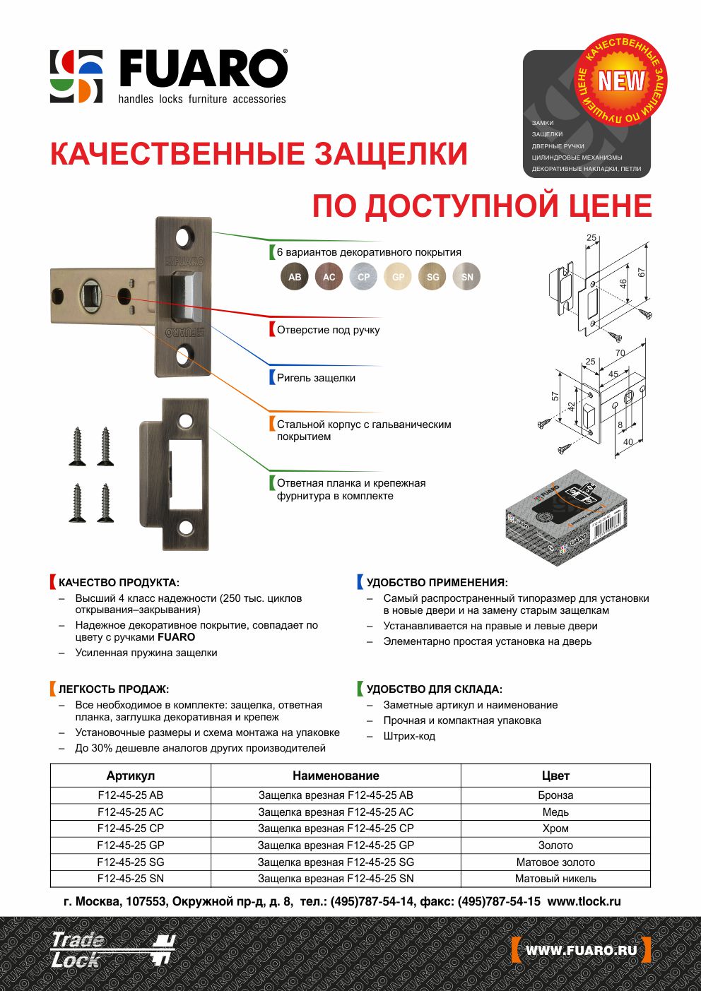 Дверная защелка Fuaro F12 предназначена для установки в деревянные двери. Корпус выполнен из стали с надежным гальваническим покрытием. Защелка легко устанавливается, подходит для дверей левого и правого открывания. Защелка F12 с усиленной пружиной имеет высший 4 класс надежности (250 000 циклов открывания/закрывания). Отверстия под стяжные винты находятся на расстоянии 38-40 мм. Размер бэксета - 45 мм. Цвет: бронза. В комплектацию входят: ответная планка, декоративная заглушка и крепежная фурнитура.