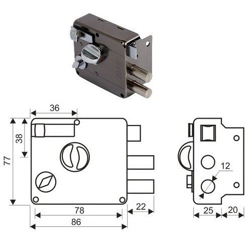 Замок накладной цилиндровый с вертушкой, фиксатором и защелкой. Класс 1 ГОСТ 5089-97. Предназначен для установки на деревянные двери. Засов из двух цилиндрических ригелей диаметром 12 мм, с максимальным вылетом 22 мм. Удаление ключевого отверстия - 50 мм. Габариты замка - 86 х 77 х 26 мм. Комплектация - 6 ключей, запорная планка, накладка. Механизм замка под англ.ключ, идет отдельно от корпуса замка. Закрывание и открывание замка изнутри производится вертушкой, снаружи ключом. Изготовитель: КНР. По заказу: Компании "ПТК", г.Екатеринбург.
