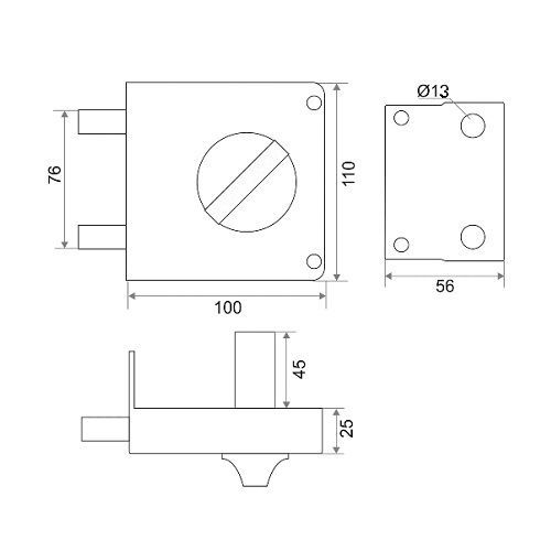 Замок накладной цилиндровый с вертушкой. Предназначен для установки на деревянные двери. Два засова круглого сечения d=13мм с максимальным вылетом 28 мм. Удаление ключевого отверстия - 60 мм. Габариты замка - 100 х 110 х 55 мм. Комплектация - 5 ключей, запорная планка, накладка. Механизм замка под англ.ключ, идет совместно с корпусом. Закрывание и открывание замка изнутри производится вертушкой, снаружи ключом. Совместим по посадочным размерам с замком ЗН1-3-2Fort Петрозаводск.