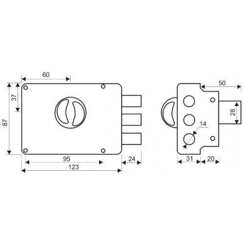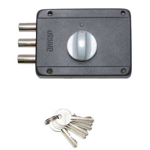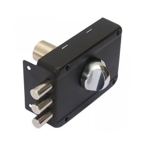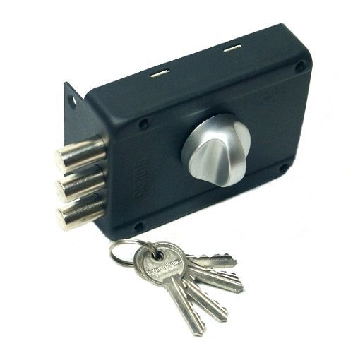 Замок накладной цилиндровый АЛЛЮР ЗН1-3-2 с вертушкой. Предназначен для установки на деревянные двери. Засов из трех цилиндрических ригелей диаметром 14 мм, с максимальным вылетом 24 мм. Удаление ключевого отверстия - 63 мм. Габариты замка - 123 х 87 х 31 мм. Комплектация - 6 ключей, запорная планка, накладка. Механизм замка под англ.ключ, идет совместно с корпусом. Закрывание и открывание замка изнутри производится вертушкой, снаружи ключом.