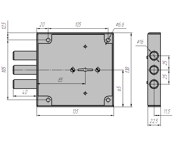 Накладной сувальдный замок хорошего качества от известного питерского производителя Цербер. Обладает защитой от высверливания, манипуляций отмычкой имеет расчетную секретность более 100’000 комбинаций, бэксет 85 мм. Габариты замка – 135 х 130 х 22,5.