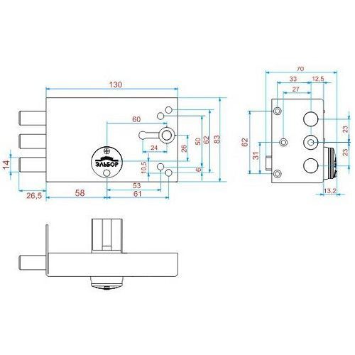 Замок накладной сувальдный общего назначения. Соответствует 4 классу ГОСТ Р 52582-2006. Габаритные размеры дверного замка 130 х 83 х 23 мм; Механизм секретности замка сувальдный; Количество сувальд 8 шт; Диаметр стержня 14 мм; Выход стержней 26,5 мм; Удаление ключевого отверстия 58 мм.