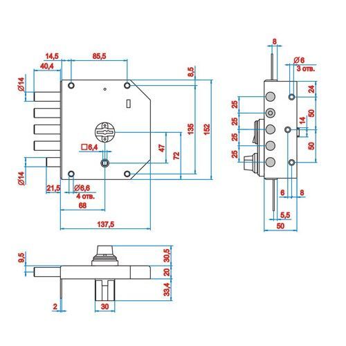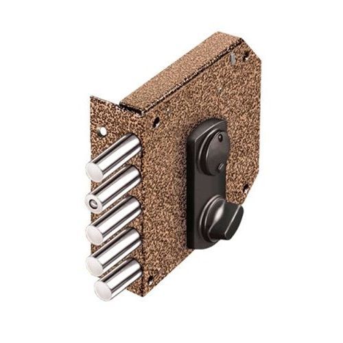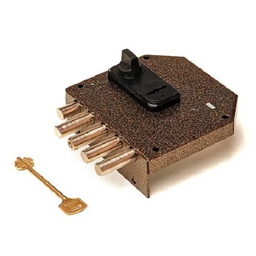 Замок имеет засов из четырех цилиндрических ригелей диаметром 14 мм, с максимальным вылетом 40 мм, и задвижку диаметром 14 мм с вылетом 21,5 мм. Удаление ключевого отверстия - 68 мм. Количество оборотов ключа - 4. Габариты замка - 138 х 152 х 20 мм.