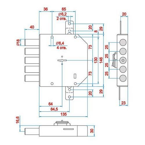 Габаритные размеры корпуса замка 135 х 146 х 30 мм; Механизм секретности замка основной сувальдный; Количество сувальд 6 шт; Количество кодовых комбинаций более 1,5 млн.; Диаметр стержня 18 мм; Выход стержней 40 мм; Точек запирания 3 (под тяги); Удаление ключевого отверстия (бэксет) 64 мм; Общая площадь поперечного сечения стержней 1271,7 мм2.