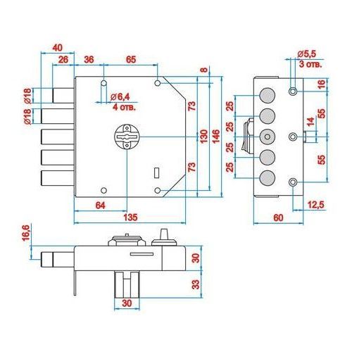Замок накладной 1.06.61.5.1.1.КМА Гранит Эльбор для дверей усиленной конструкции, соответствует 4му высшему классу безопасности, сертифицирован по ГОСТ 5089-2003. Механизм сувальдного типа обеспечивает более 1,5 млн. комбинаций. Габаритные размеры корпуса замка 135 х 146 х 30 мм; Механизм секретности замка основной сувальдный; Количество сувальд 6 шт; Количество кодовых комбинаций более 1,5 млн; Диаметр стержня 18 мм; Выход стержней 40 мм; Удаление ключевого отверстия (бэксет) 64 мм. Общая площадь поперечного сечения стержней 1017,8 мм2.