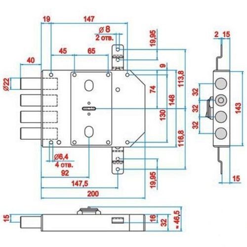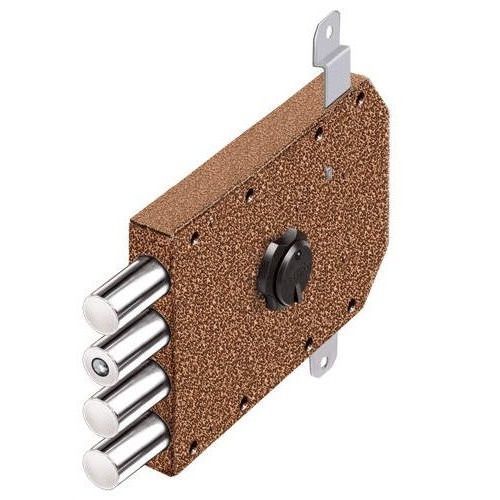 Накладной гаражный замок для бронированных и металлических дверей усиленной конструкции. Диаметр стержней замков составляет 22 мм. Удаление ключевого отверстия (бэксет) 92 мм. В одном из стержней засова обязательно наличие термообработанной вставки, являющейся защитой от перепиливания. Общая площадь стержней составляет 1519,76 мм2. Для полноценной защиты замка от высверливания предусматривается обязательная комплектация бронепластиной из термообработанной стали толщиной 2 мм 65Г ГОСТ 14959-79. В замке 1.09.56. бронепластина заранее установлена между внутренней направляющей и крышкой. При полном вылете стержней на 40 мм 30 мм остается в корпусе замка, что исключает возможность «загиба» стержней при попытке силового вскрытия двери. Отсутствие смещения тяг и стержней относительно корпуса замка облегчает установку замка в дверь. В замке использованы 12 сувальдных пластин, благодаря которым обеспечивается высокая стойкость замка к вскрытию отмычками. Важной особенностью замков серии «САПФИР» является основание с отгибкой, обеспечивающее увеличение прочности сварного шва основания со стержнями. Такой способ крепления является наиболее надежной защитой от силового взлома замка методом "отжима". Количество кодовых комбинаций составляет 3 000 000. Углы корпуса проварены.