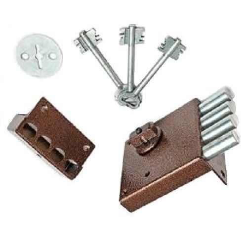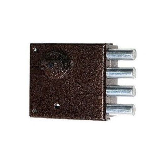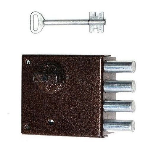 Замок накладной четырех ригельный шести сувальдный четыре оборота ключа , открывается с наружи ключом. Диаметр и выход ригелей: 14х32 мм. ДхВхШ замка: 100 х 93 х 21 мм. Тип ригелей: Цилиндрические. Количество ригелей: 4. Удаление ключевого отверстия (Backset): 60 мм. Количество ключей: 3 шт. Количество точек запирания: 1. Способ запирания изнутри: Поворотной ручкой.