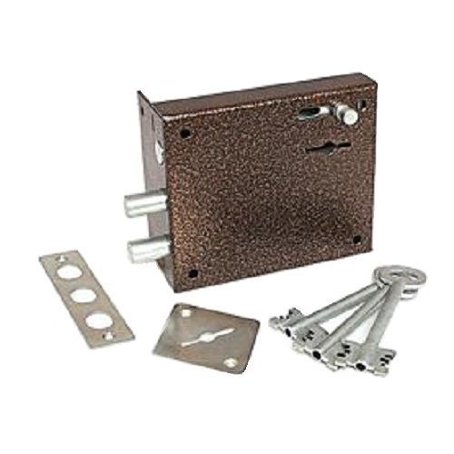 Замок накладной трехригельный с задвижкой, шести сувальдный, четыре оборота ключа, открывается с двух сторон ключом диаметр и выход ригелей 14 х 32 мм. Тип ригелей: Цилиндрические. Количество ригелей: 2. Удаление ключевого отверстия (Backset): 105 мм. Тип механизма секретности: Сувальдный. Количество ключей: 3 шт. Способ запирания изнутри Ключом. Дополнительное запирание изнутри: задвижка.