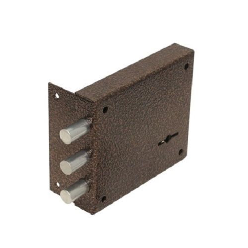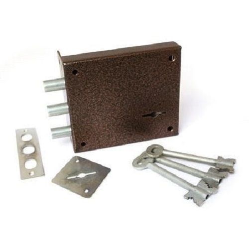 Замок накладной четырех ригельный шести сувальдный четыре оборота ключа, открывается с двух сторон ключом диаметр и выход ригелей 14 х 32 мм. Тип ригелей Цилиндрические Количество ригелей 3. Защелка Отсутствует. Удаление ключевого отверстия (Backset) 105 мм . Количество ключей 3 шт. Количество точек запирания 1. Способ запирания изнутри Ключом. Цвет корпуса Бронзовый антик.