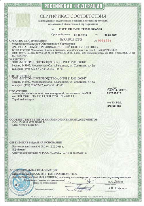 Замок накладной сувальдный, сертифицирован в соответствии с 4-м, самым высоким классом безопасности по ГОСТ (три из пяти сувальд снабжены ложными пазами).