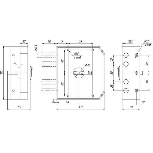 Модель комплектуется пятью латунными ключами и декоративной накладкой из нержавеющей стали (для внешней стороны двери). Габаритные размеры корпуса замка: 150 х 137 х 65 мм. Удаление ключевого отверстия (бэксет): 64 мм.