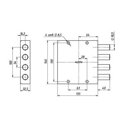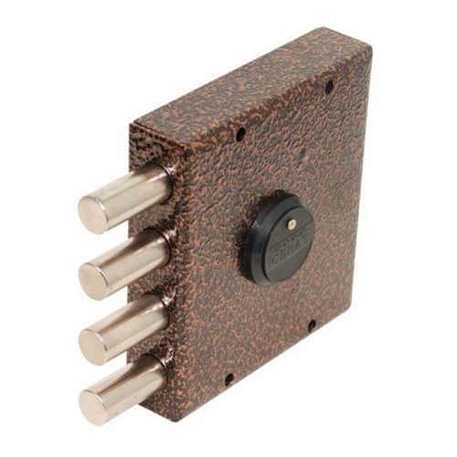 Замок накладной сувальдный гаражный. Предназначен для установки на металлические двери. Засов из четырех цилиндрических ригелей диаметром 18,5 мм, с максимальным вылетом 40 мм. Удаление ключевого отверстия - 64 мм. Количество полуоборотов ключа - 4. Габариты замка - 135 х 146 х 32,5 мм. Защита от вскрытия замка отмычкой, защита от высверливания стойки ригеля и защита от вскрытия.