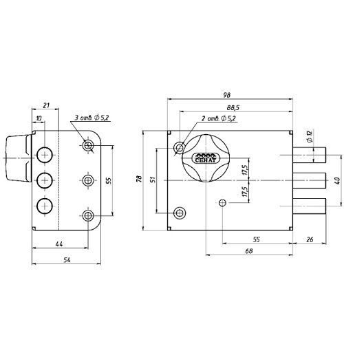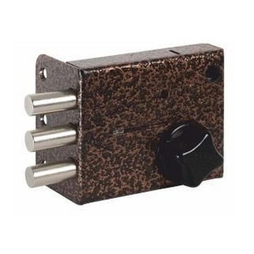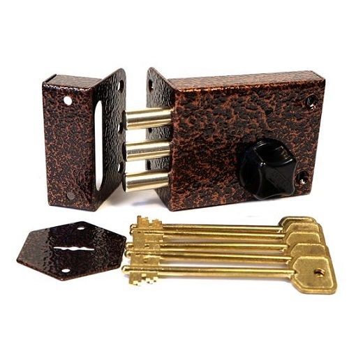 Замок накладной СЕНАТ ЗНС-10-3 (5 ключей) Засов из трех стальных цилиндров диаметром 12 мм., с внутренней стороны открывается и закрывается ручкой (постоянным ключом), с наружи – комплектным ключом с двумя бородками. Удаление ключевого отверстия -55 мм. Количество полуоборотов ключа - 2. Габариты замка - 98х78х21 мм.