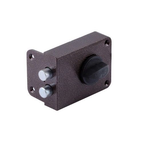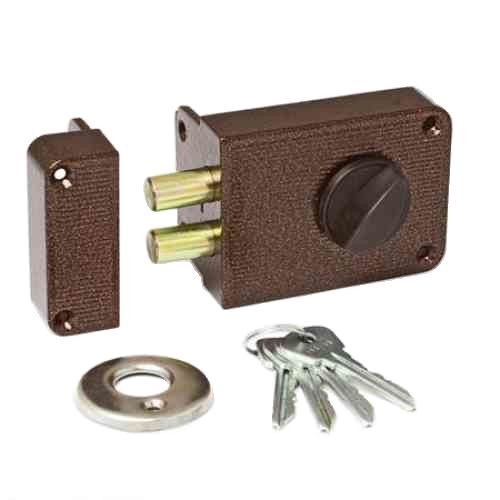 Замок устанавливается изнутри двери из дерева или металла толщиной 35-45 мм на поверхность полотна слева или справа. Снаружи открывается и закрывается английским ключом, изнутри - поворотом рукоятки. Выдалбливание паза с торца двери не требуется, личинка ключа выводится наружу через сквозное отверстие и прикрывается стальной накладкой. Механизм запирания имеет 15 000 комбинаций. Автоматического запирания нет. Два ригеля цилиндрической формы надежно закрывают дверь в одной точке. Ригели фиксируются изнутри защелкой в выдвинутом состоянии. Удаление ключевого отверстия от края полотна - 60 мм. В комплекте 4 ключа, ответная часть, наружная накладка, винты и шурупы для установки. Страна-производитель - Россия.