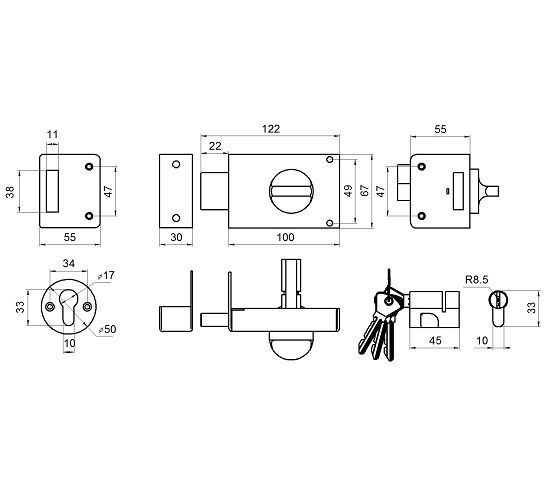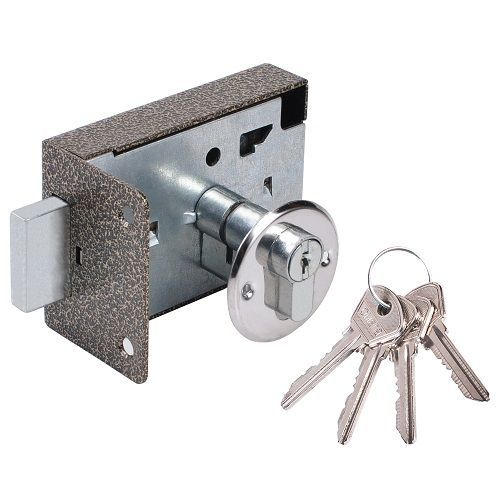 Замок накладной, предназначен для установки в деревянные и стальные двери правого и левого открывания толщиной до 45мм. Окрашен полимерными красками: медь, бронза, серебро и металлизированными покрытиями: голд, хром. Ригель стальной прямоугольного сечения. Закрывание и открывание изнутри производится вертушкой, снаружи ключом. Имеется блокировка от открывания ключом снаружи, путем доворота вертушки в крайнее положение при открытом ригеле. Механизм секрета цилиндрический односторонний с английским ключом. Укомплектован 4-мя ключами, запорной коробкой и накладкой.