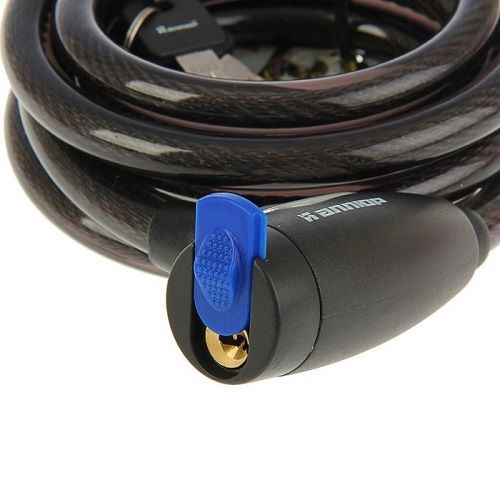 Замок навесной с тросом. Материал корпуса - сталь покрыта пластиком. Стальной трос в пластиковой оплетке (12мм - диаметр, 1500мм - длина). Цилиндровый механизм секрета, в комплекте 3 перфоключа. Защитная шторка на скважине препятствует попаданию в механизм грязи и влаги. Предназначен для запирания дверей, ворот, а также для предотвращения хищения велосипедов, детских колясок, санок, лодочных моторов и др. предметов.