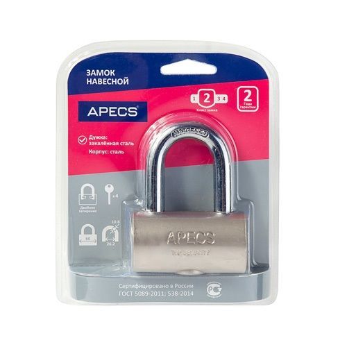 Навесной замок "Apecs" PDS-32-60. Ширина корпуса - 60мм, материал - сталь. Гарантия от производителя 3 года. Технические характеристики и размеры навесного замка смотрите в описании.