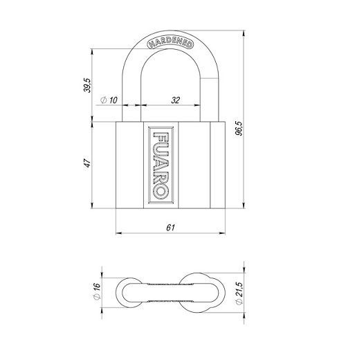 Навесной замок Fuaro PL-4061 предназначен для запирания внутренних и уличных дверей, оснащенных проушинами. Чугунный корпус с антикоррозийным покрытием. Коррозийная стойкость покрытия - 250 часов. Закаленная дужка для защиты от спиливания. Работоспособность навесного замка - 250 000 циклов открывания/закрывания. В комплектацию входят 3 английских ключа с пластиковой головкой. Габаритные размеры навесного замка указаны на чертеже. Упаковка: блистер.
